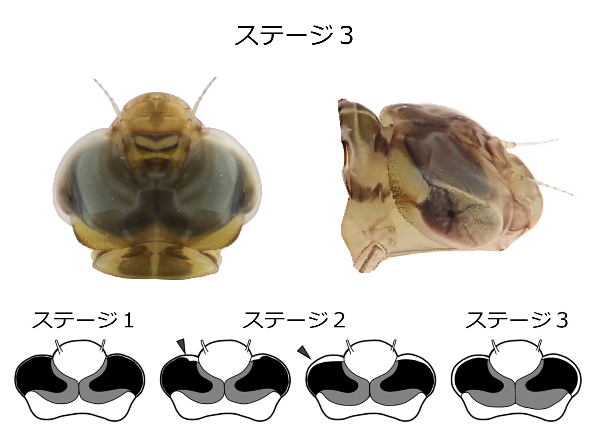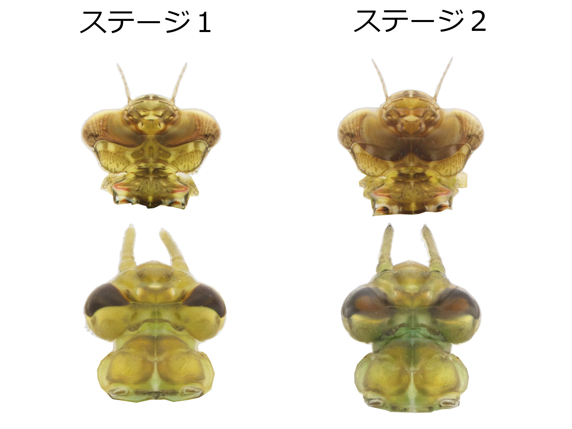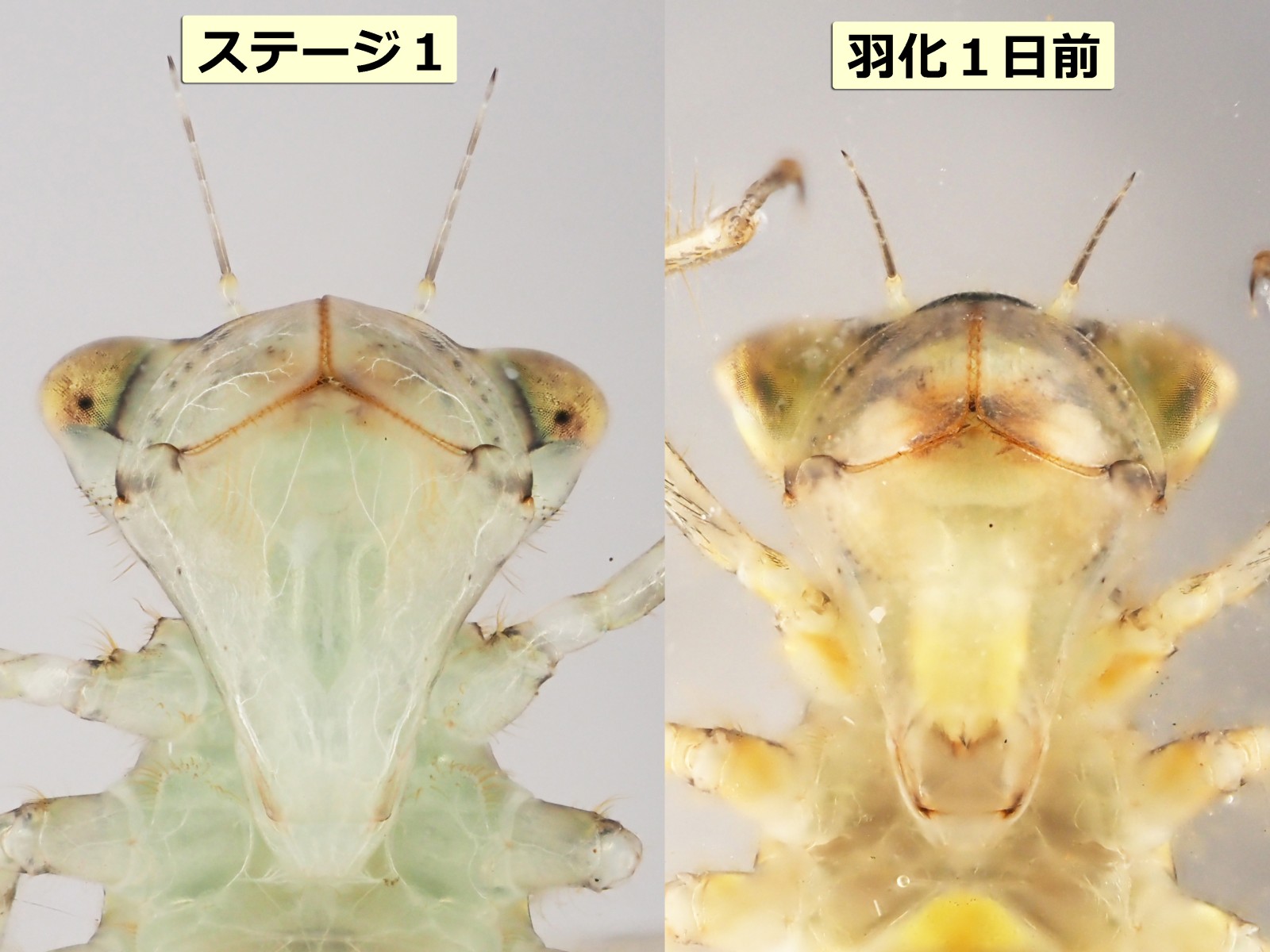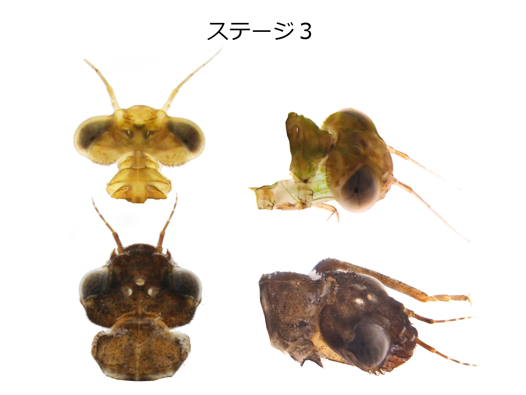 • トンボ科とヤンマ科の一部の種では、ステージ2で複眼においてアポリシス(羽化の際に外表のクチクラから内部がはがれること)様変化が観察される。ステージ3では、他科でも多くの種で複眼と表皮の間に間隙ができているのが確認できる。