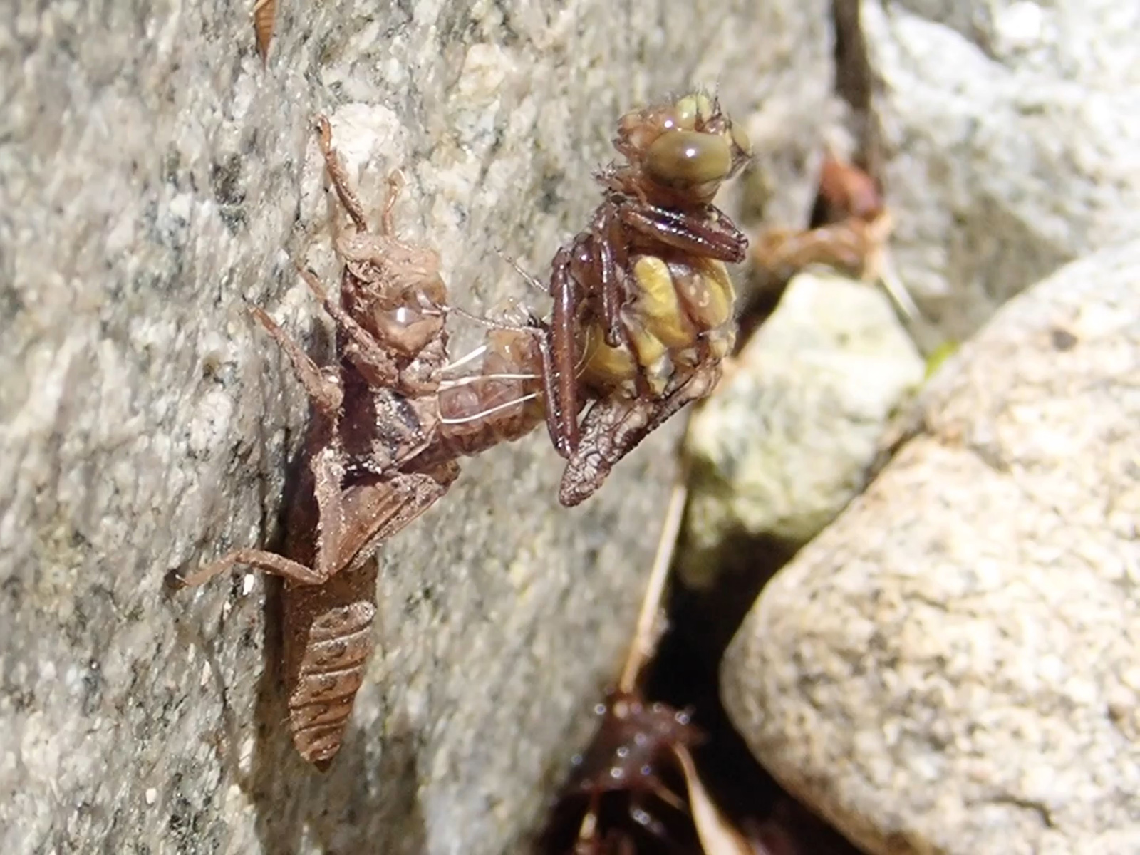 • 分割羽化:羽化のために水から出た幼虫が低温のせいで再び水中に戻り、後日適温になった日に羽化することがある。これを分割羽化と呼んでいる。