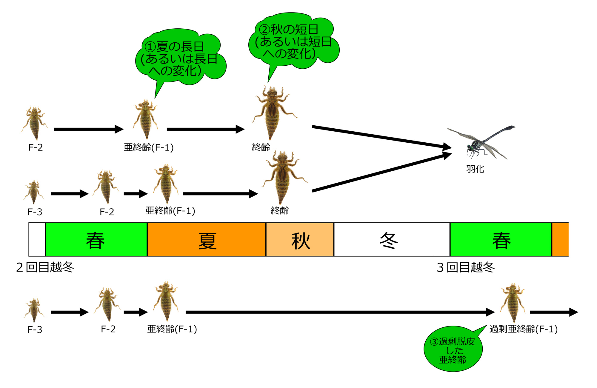 • キイロサナエは2回目の冬をF-2(終齢の2つ手前)あるいはF-3で越す。春になり再び脱皮を開始するが、亜終齢(F-1)の時点で①夏の長日(あるいは長日への変化)が引き金となりいったん発育が遅延する。その後②秋の日照時間(あるいは日照時間の変化)が引き金となって発育遅延が解除され、タイミングを揃えて終齢となる。そのまま、終齢で越冬し春にタイミングを揃えて羽化する。