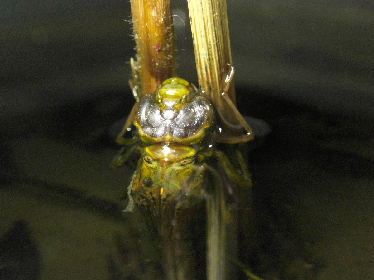 羽化前に胸部を水面上に出すクロスジギンヤンマの終齢幼虫(写真では気門は水中にある)。