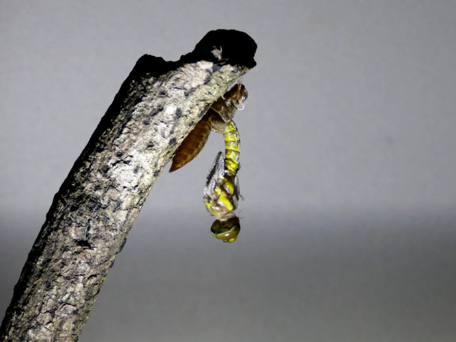 マルタンヤンマの羽化ステージ3。殻から完全に抜け出し、翅と腹部が完全なサイズまで伸びる。