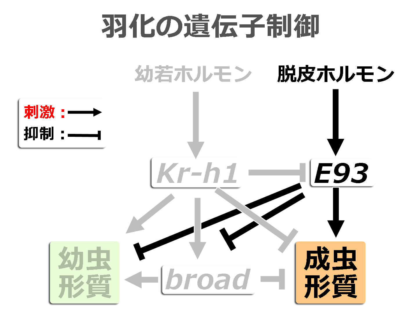 羽化の際の遺伝子制御。幼若ホルモンがほぼないため、E93への抑制が起こらず成虫形質に傾き、羽化が引き起こされる。