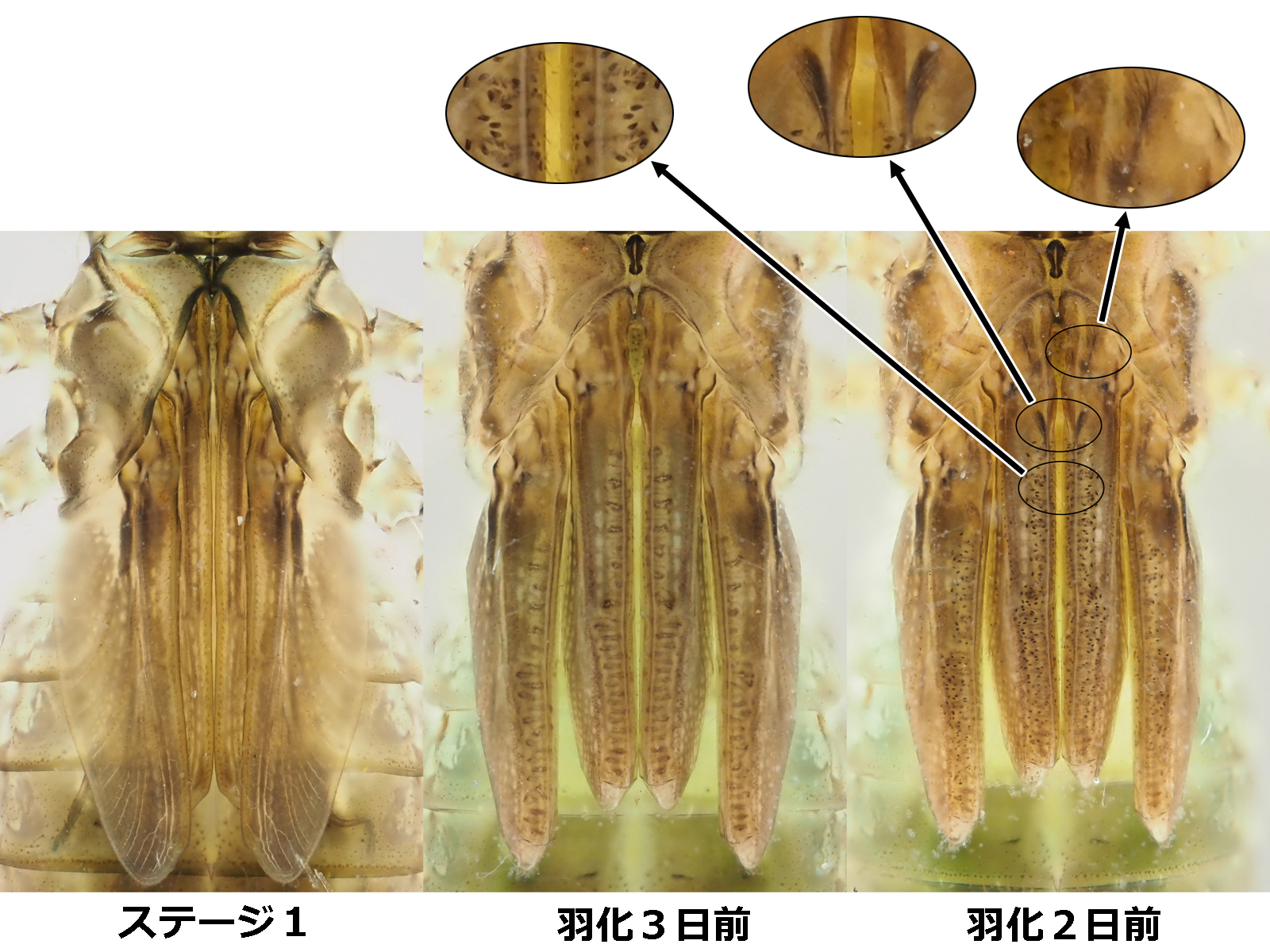 ムツアカネの翅芽の変化。羽化2日前になると、翅芽に顆粒状や斑状の着色が現れる。