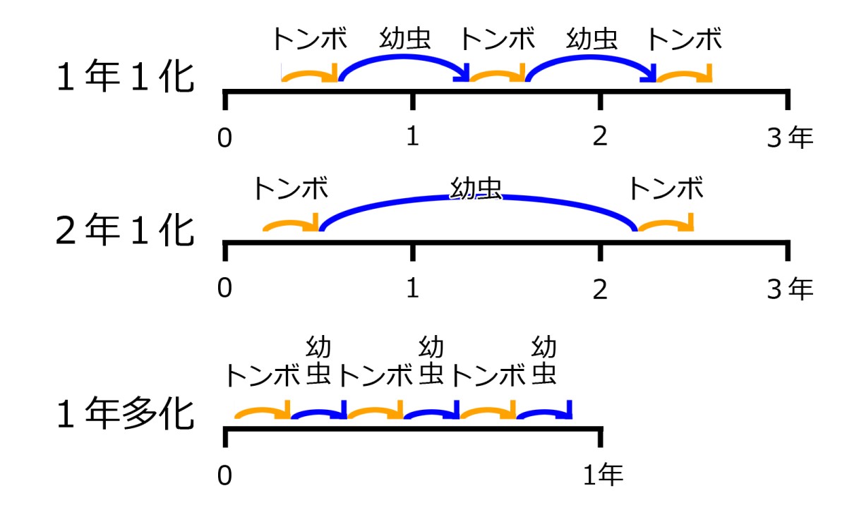 • ヤンマ科:多年1化種が多い(主に、北方種と渓流種)。他は1年1化だが、トビイロヤンマのみ1年多化。